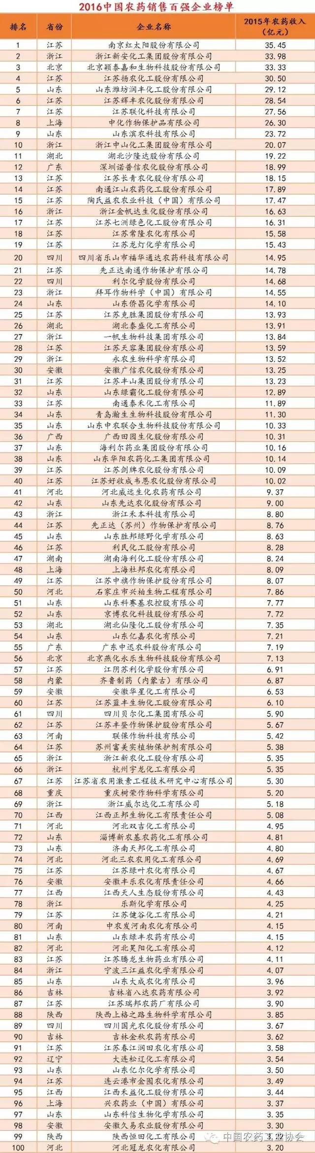 今日上午,2016中國農(nóng)藥銷售百強企業(yè)榜單在第三屆農(nóng)藥行業(yè)經(jīng)濟運行分析會暨農(nóng)藥行業(yè)排行榜發(fā)布會上隆重發(fā)布,南京紅太陽股份有限公司以35.45億元的銷售額高居榜首,浙江新安化工集團股份有限公司和北京穎泰嘉和生物科技股份有限公司分別以33.98億元和33.33億元的業(yè)績摘得榜眼和探花之位。