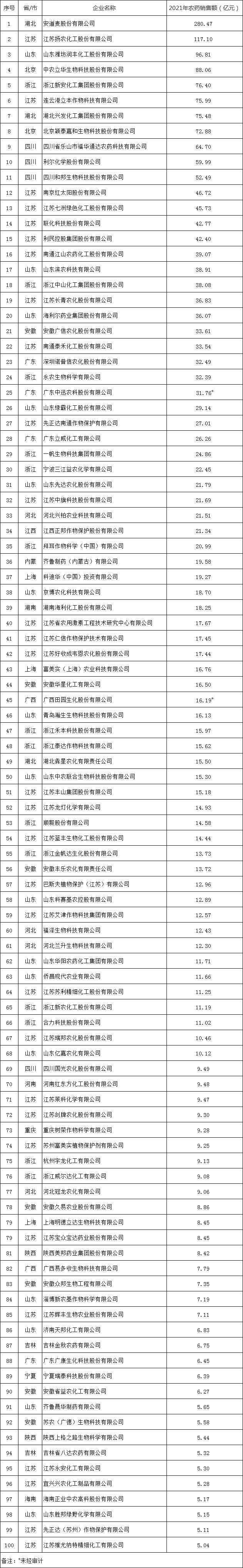 7月7日,浙江紹興,2022全國農藥行業銷售TOP100在第九屆農藥行業經濟運行分析會暨2022農藥行業名單發布會上揭曉,其中安道麥股份有限公司銷售額達280.47億元,位居首位,江蘇揚農化工股份有限公司銷售額達117.10億元,山東濰坊潤豐化工股份有限公司銷售額達96.81億元。