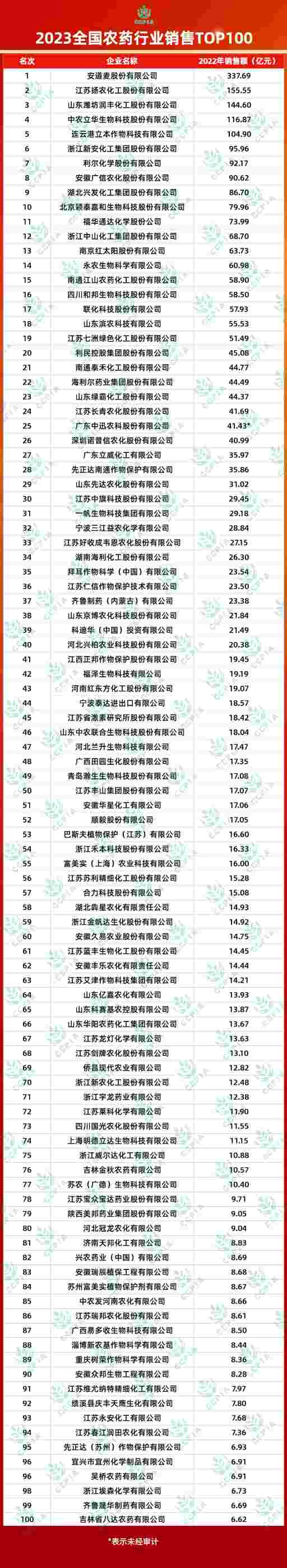 2023全國農藥行業銷售TOP100揭曉