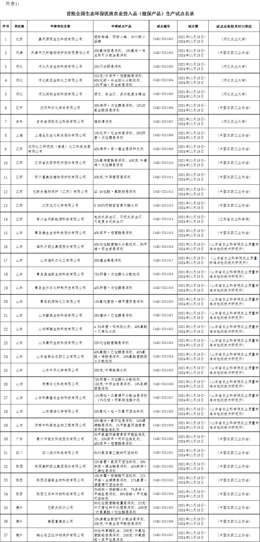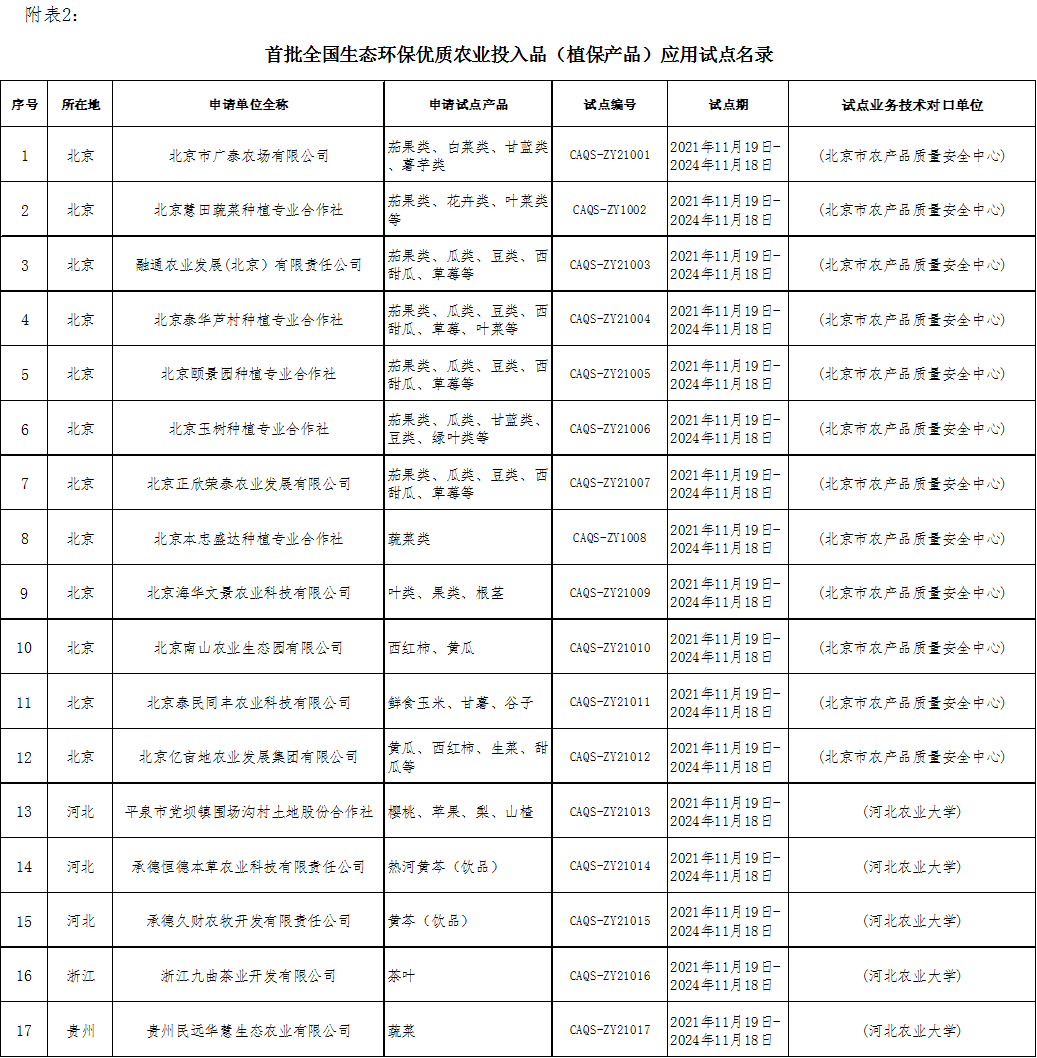 根據(jù)國家農(nóng)安中心《關(guān)于提供生態(tài)環(huán)保優(yōu)質(zhì)農(nóng)業(yè)投入品(植保用品)試點材料的函》(農(nóng)質(zhì)安(投)函〔2021〕129號)要求,由全國各農(nóng)業(yè)投入品(植保產(chǎn)品)生產(chǎn)與應用單位自愿申請,經(jīng)所在地(市、縣、區(qū))及省級農(nóng)產(chǎn)品質(zhì)量安全與優(yōu)質(zhì)化工作機構(gòu)審核推薦,國家農(nóng)安中心組織專家技術(shù)評審和網(wǎng)上公示,確認將嘉禾源碩生態(tài)科技有限公司等37家植保產(chǎn)品生產(chǎn)單位納入首批全國生態(tài)環(huán)保優(yōu)質(zhì)農(nóng)業(yè)投入品(植保產(chǎn)品)生產(chǎn)試點范圍,將北京市廣泰農(nóng)場有限公司等17家植保產(chǎn)品應用單位納入首批全國生態(tài)環(huán)保優(yōu)質(zhì)農(nóng)業(yè)投入品(植保產(chǎn)品)應用試點范圍(詳見附表),探索開展生態(tài)環(huán)保優(yōu)質(zhì)化試點,試點期3年。