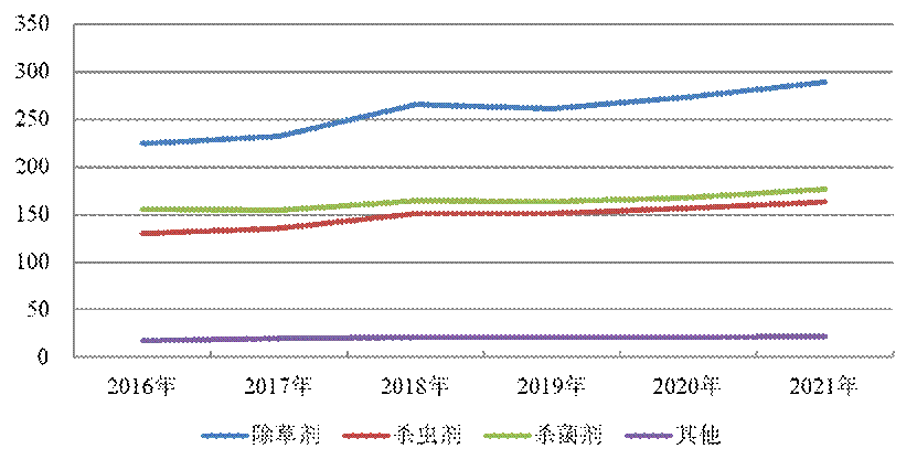 圖1 2016-2021年全球作物保護用農藥分類別銷售額(億美元)