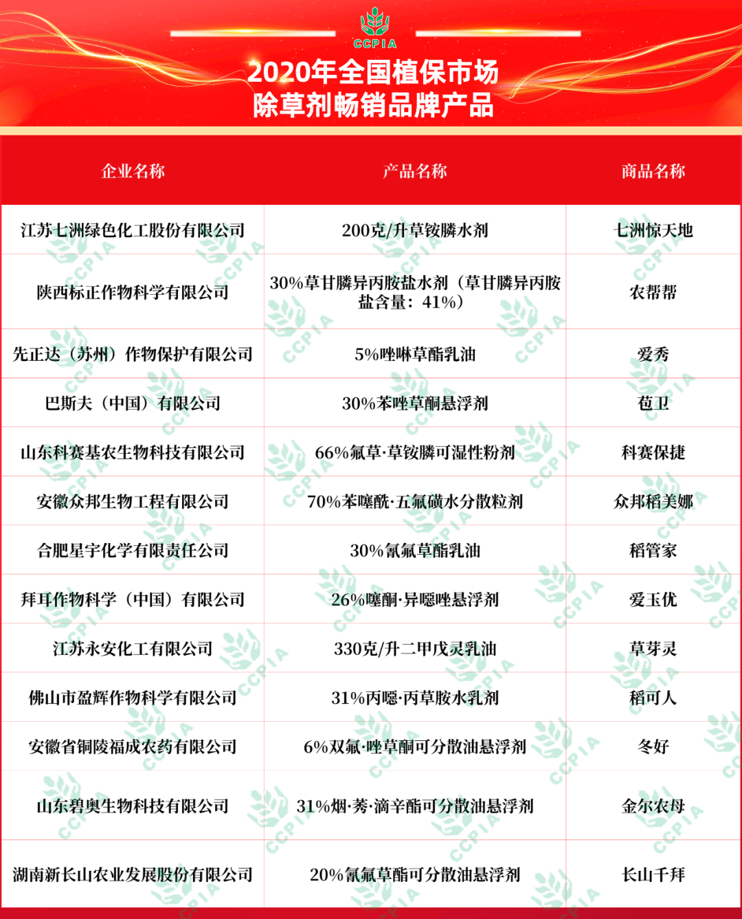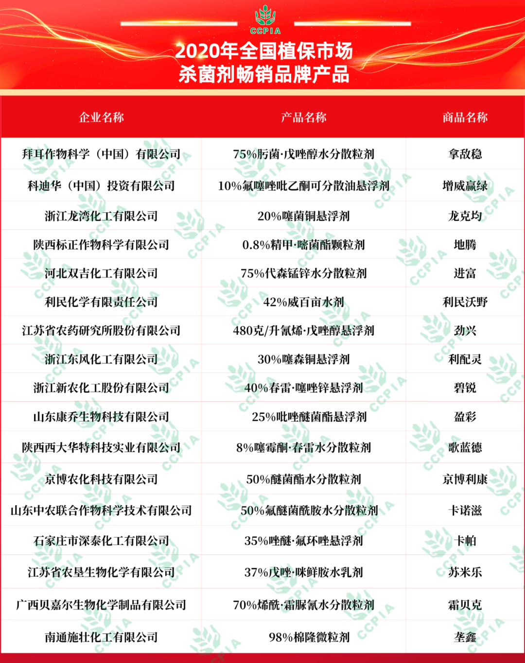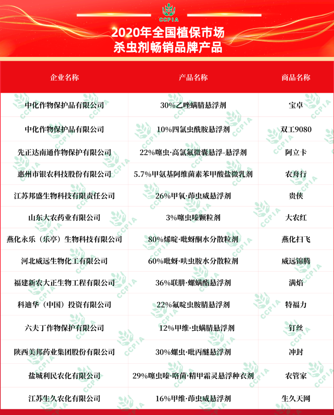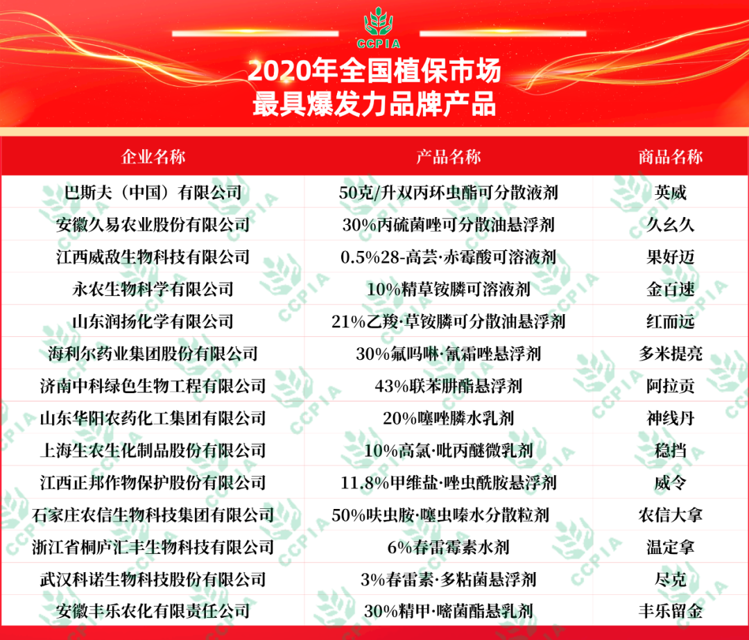 5月13日,安徽合肥,“2020年全國植保市場暢銷品牌產(chǎn)品”在第八屆農(nóng)藥行業(yè)經(jīng)濟(jì)運(yùn)行分析會暨農(nóng)藥行業(yè)排行榜發(fā)布會上隆重揭曉。