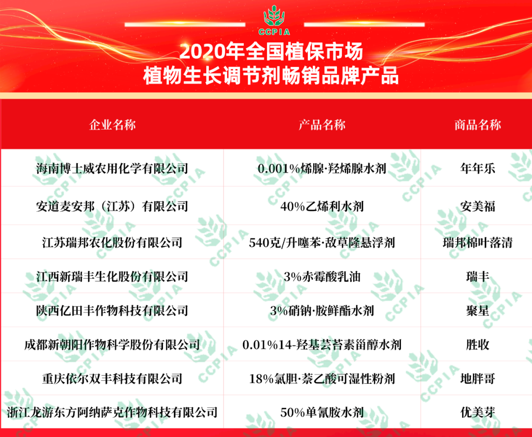 植物生長調(diào)節(jié)劑暢銷品牌產(chǎn)品中,海南博士威年年樂(0.001%烯腺.羥烯腺水劑)、安道麥安邦安美福(40%乙烯利水劑)、新朝陽勝收(0.01%14-羥基蕓苔素甾醇水劑)等植調(diào)劑產(chǎn)品也榜上有名。