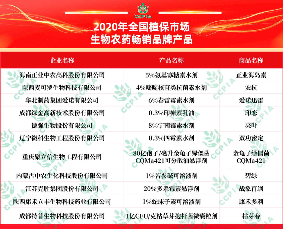 生物農(nóng)藥暢銷品牌產(chǎn)品中,海南正業(yè)正業(yè)海島素(5%氨基寡糖素水劑)、麥可羅農(nóng)抗(4%嘧啶核苷類抗菌素水劑)、綠金高新印戀(0.3%印楝素乳油)等產(chǎn)品上榜。