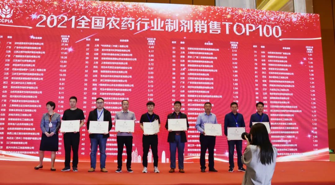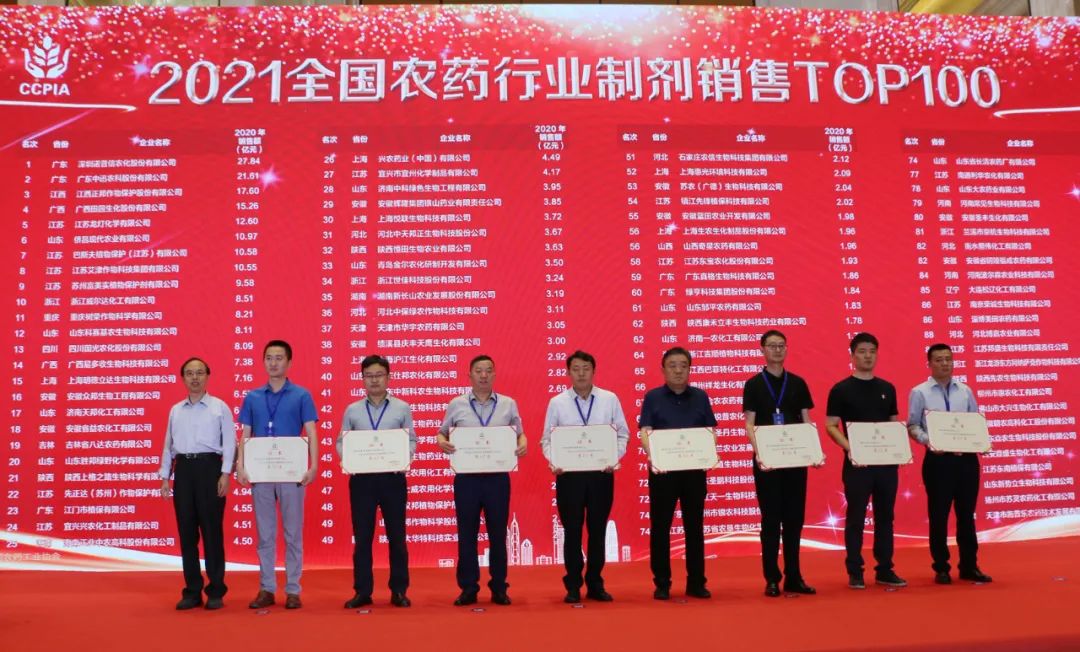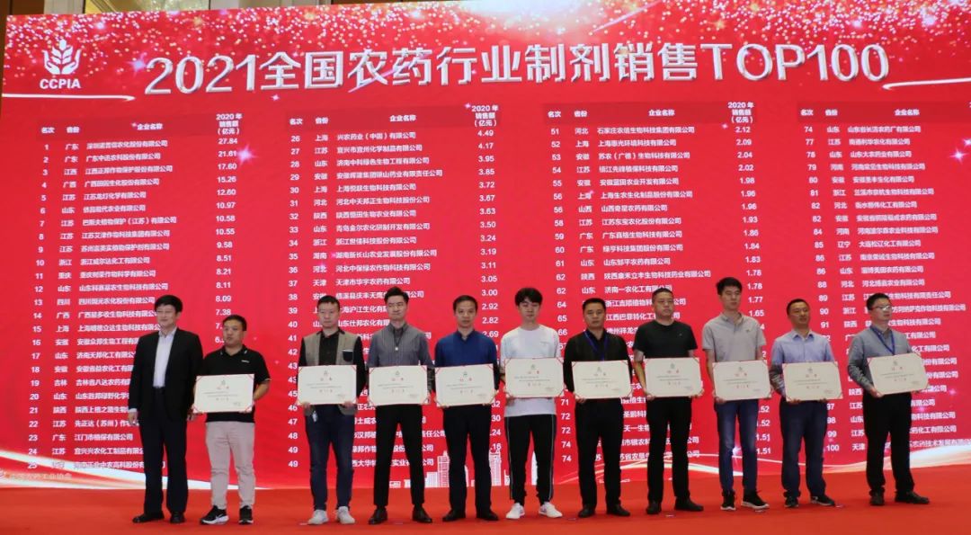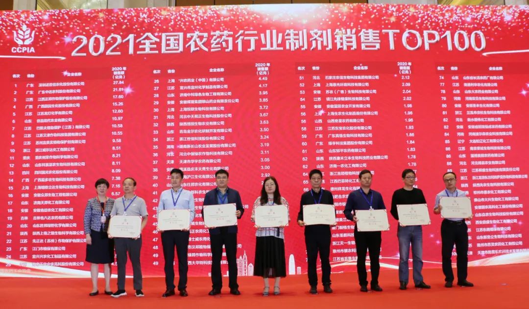 5月13日上午,在第八屆農藥行業經濟運行分析會暨農藥行業排行榜發布會上,中國農藥工業協會揭曉了2021全國農藥行業制劑銷售TOP100。2021年全國農藥行業制劑銷售TOP100中,深圳諾普信農化股份有限公司以27.84億元的銷售額蟬聯榜首,廣東中迅農科股份有限公司、江西正邦作物保護股份有限公司分別以21.61億元、17.60 億元的銷售額位列第二、第三名。
